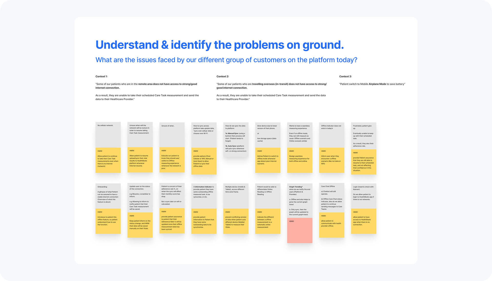 We conducted stakeholder-informed research, gathering insights from stakeholders who had direct interactions with providers and patients. These insights helped us understand user challenges and shaped the design direction for Offline Mode. To develop targeted solutions, we translated these challenges into “How Might We” (HMW) questions, which guided our ideation and feature brainstorming.