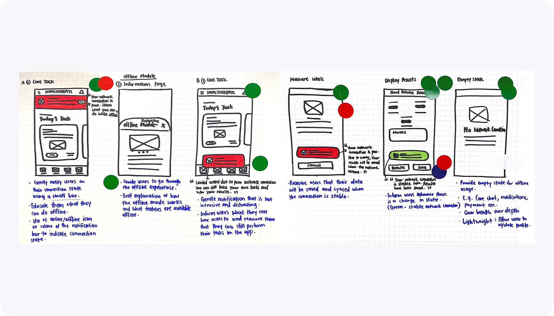 During concept sketching, we generated and organised ideas into clear user flows, using notes and quick sketches to communicate concepts. The team then voted on the solutions with the most impact to prioritise ideas for further development.