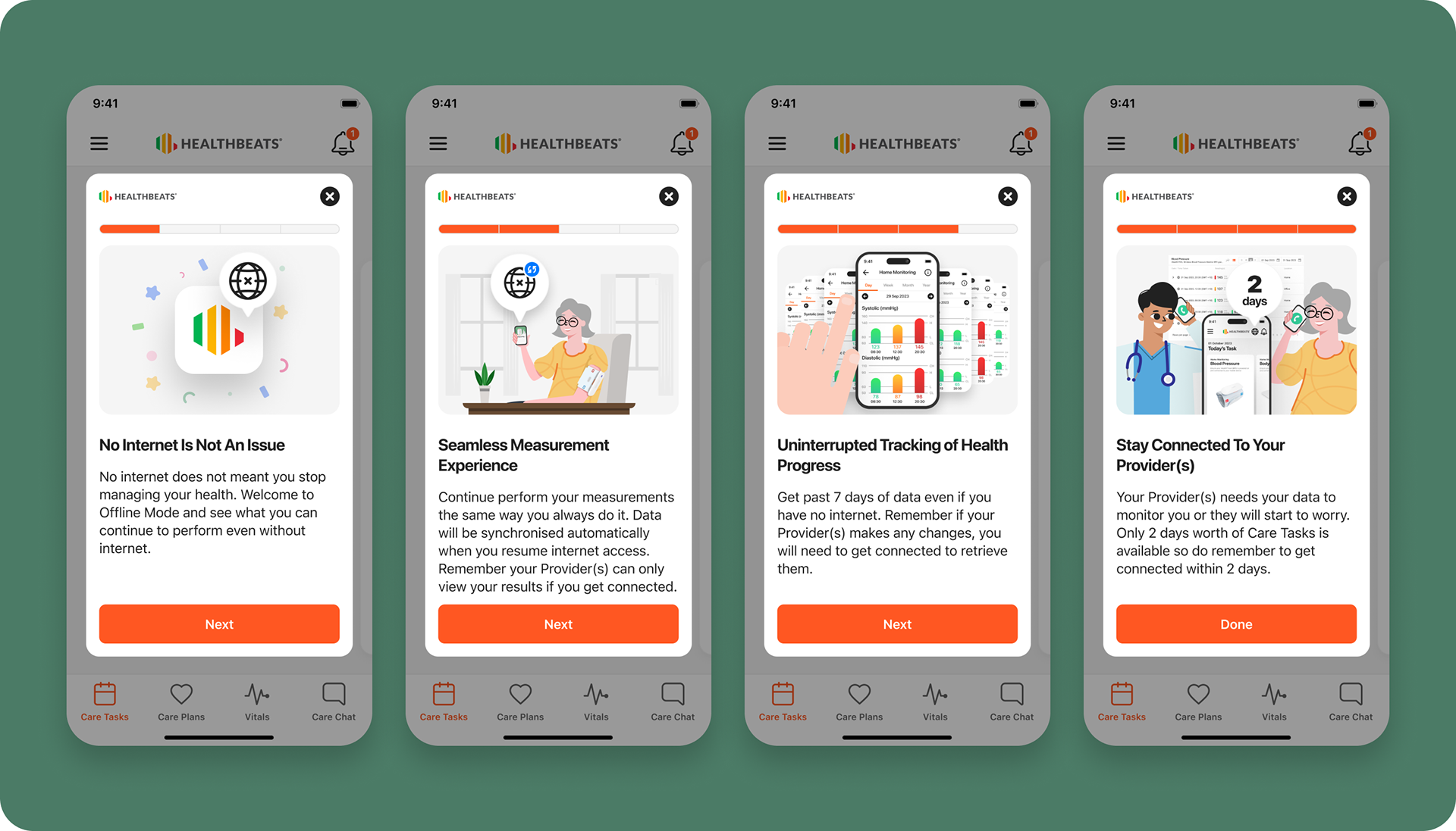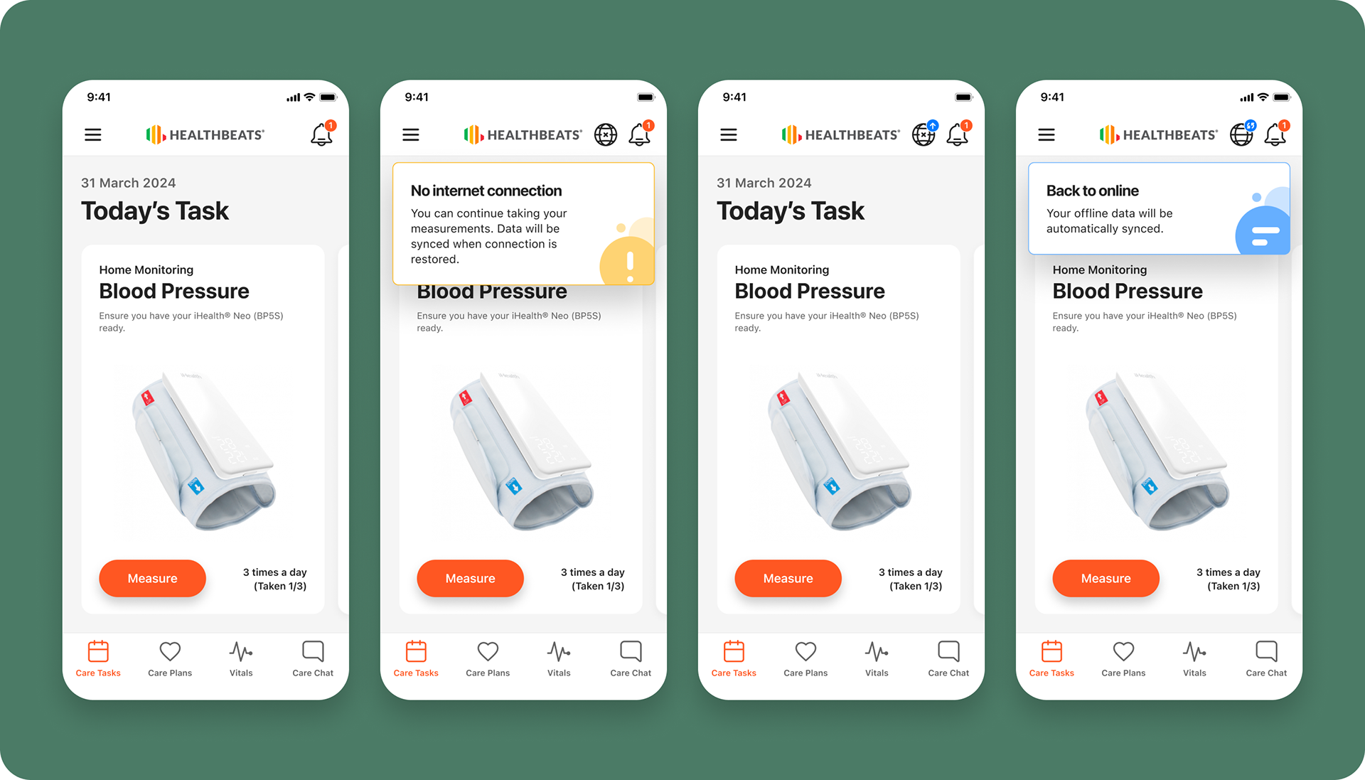 The goal of this module was to enable patients to take vitals measurements anytime, anywhere, without requiring an active internet connection, while ensuring care teams could continue to monitor and act on the data once connectivity was restored.