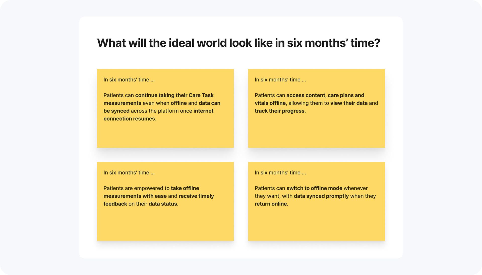 We defined clear sprint goals to align the team and guide the design process. We envisioned the ideal offline measurement experience six months into the future, defining what success would look like for both patients and healthcare providers. This focus helped ensure our ideation and feature designs addressed the most critical user needs.